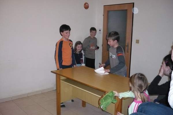 Po tomto poobědním čase si každá skupinka ( 3 skupinky dětí a 1 vedoucích) měla připravit scénku, která musela obsahovat předem stanovená slova ( každá skupinka měla slova jiná ). Vedoucí sehráli drama O Popolušce, jedna ze skupinek sehrála veselou scénku imitující jejich „oblíbenou" paní učitelku, jiná pohádku a čtvrtá příběh ze říše zvířat.